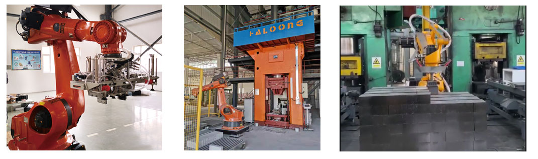 根據(jù)制品形狀尺寸設(shè)計專用夾具,采用機器人取磚碼垛工作效率高,動作精準統(tǒng)一,24小時工作無疲勞。(機器人選型根據(jù)負載和使用要求來選型)